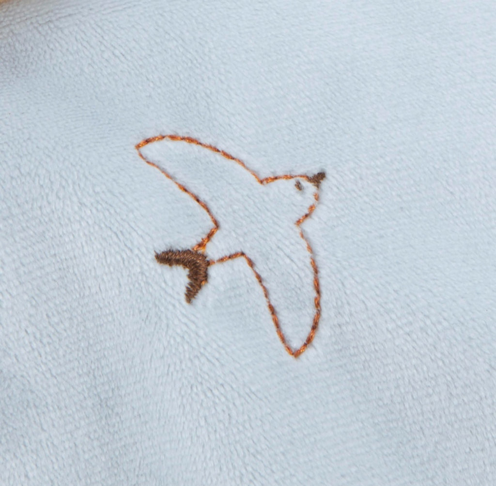 The soft, cuddly body of this micro-velvet comforter will delight baby, who won't stop cuddling it! In a lovely blue colour, this square comforter has 4 knots for the child to manipulate, which are also very useful for attaching the dummy and keeping it close by. The bear's little face and the gingham print give the comforter a real timeless style. It also has an embroidered swallow in relief, as if placed on its heart, and small dots, which are very pleasant to touch.