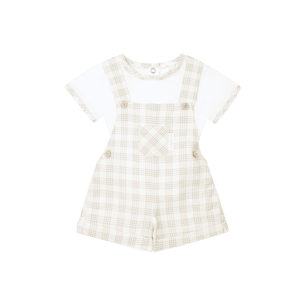 The Ansty Dungaree Set is a classic, charming outfit for baby boys and toddlers — perfect for parents looking for beige checked dungarees, pastel baby outfits, or stylish summer clothing. Designed in Pastels & Co’s signature soft neutral palette, this set blends comfort with timeless boutique style.