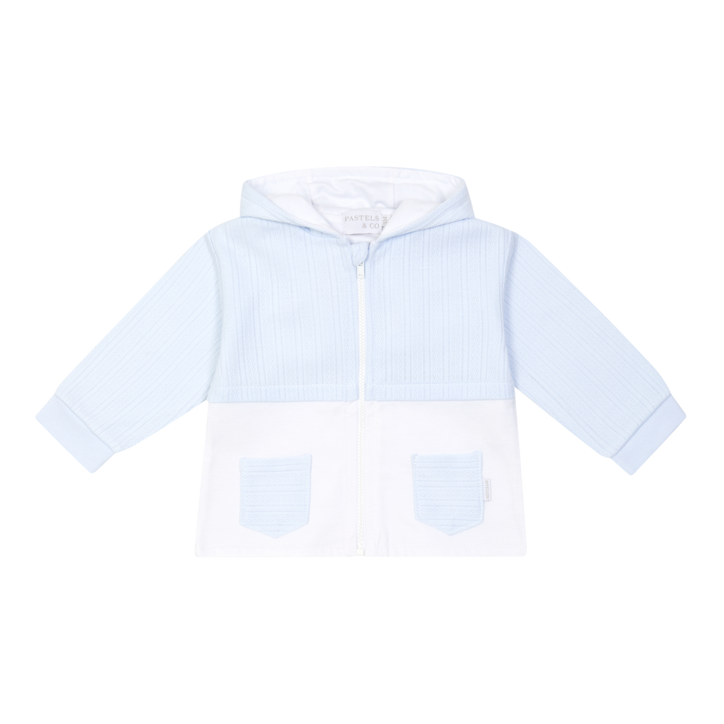 A cosy and stylish layer for little ones, the Hector Blue Jacket blends comfort with a classic baby look. Designed in soft blue with a gentle ribbed texture on the upper body and sleeves, it features a smooth white lower panel and two sweet front pockets. The zip‑up front and hood make it practical for everyday wear while keeping your little one snug.