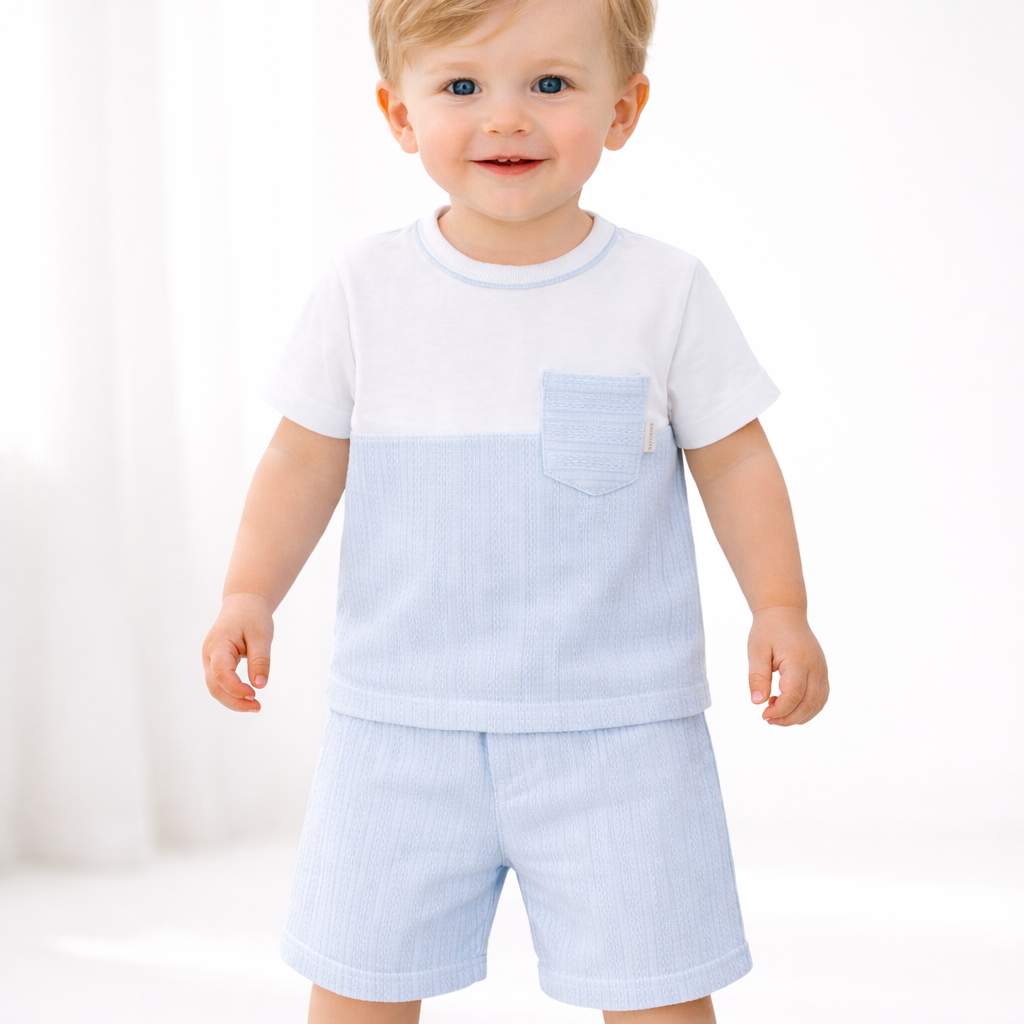 A fresh and classic summer set for little boys, the Henry outfit pairs a crisp white short‑sleeve top with a soft blue textured panel and matching shorts. The subtle detailing and gentle fabrics make this an easy, comfortable choice for warm days while still looking beautifully put‑together.
