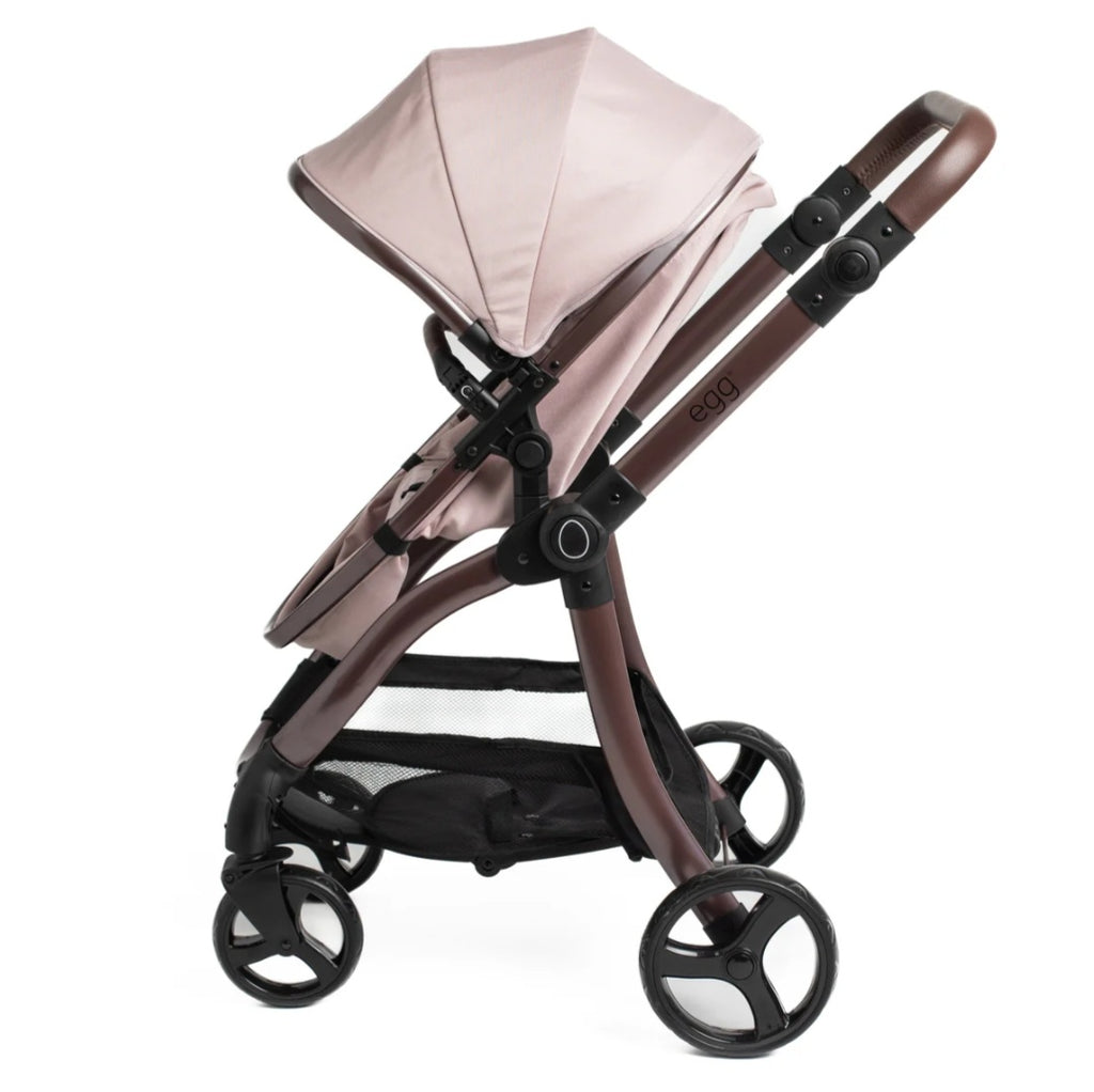 Included in the box is a coordinating apron for use in carrycot mode. The fabrics are the same stunning Hush Violet colourway found on the full size egg2® stroller. Finished on a gloss chassis with cocoa leatherette hand-stitched handle bar.